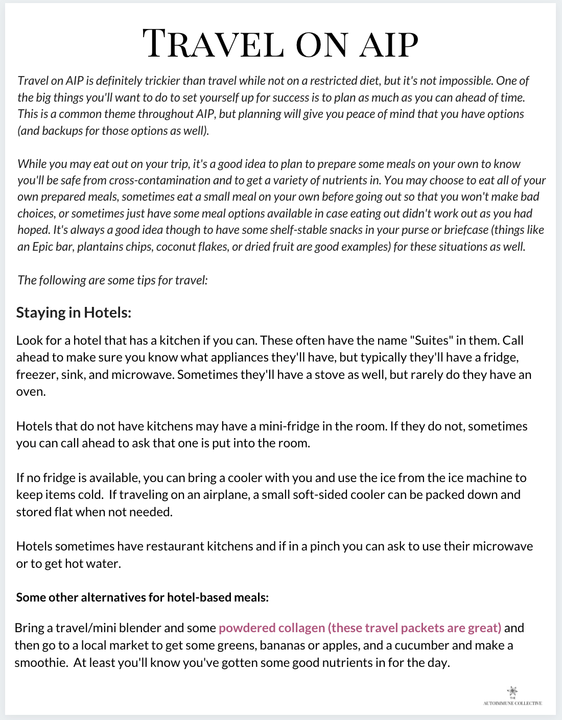 Download the travel guide by clicking/tapping on the picture below. It reiterates what I say in the video so you don’t need to take notes. I’ve also included the Emergency Snacks sheet again just in case you didn’t download it from the AIP Snacks lesson as these are snacks you can eat and get on-the-go.