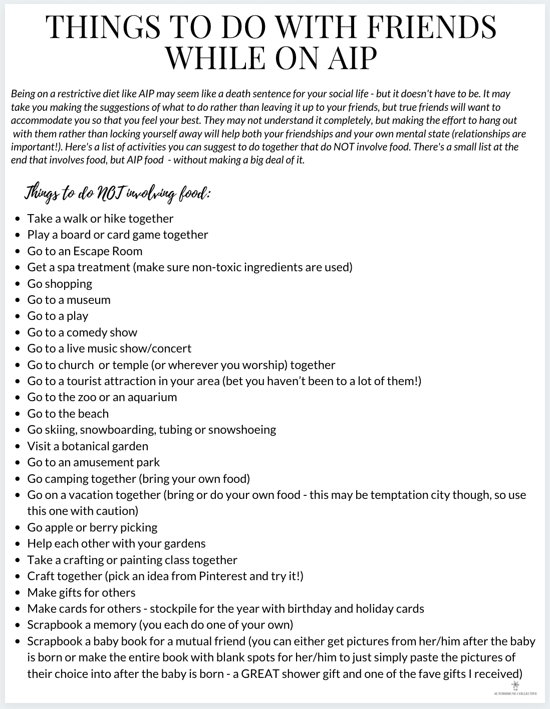 Download the Eating Over Other’s guide by clicking or tapping on the picture below. It reiterates what I say in the video so you don’t need to take notes. There’s also a “Things to do With Friends While on AIP” guide which gives tons of ideas of things to do NOT involving food and a few involving food.